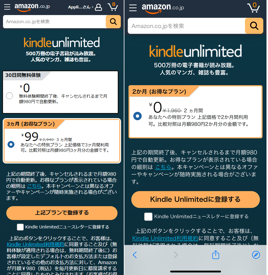 ユーザーごとに異なるキャンペーン内容が提示される場合があるため、まずはKindle Unlimitedの登録ページで確認してみましょう。