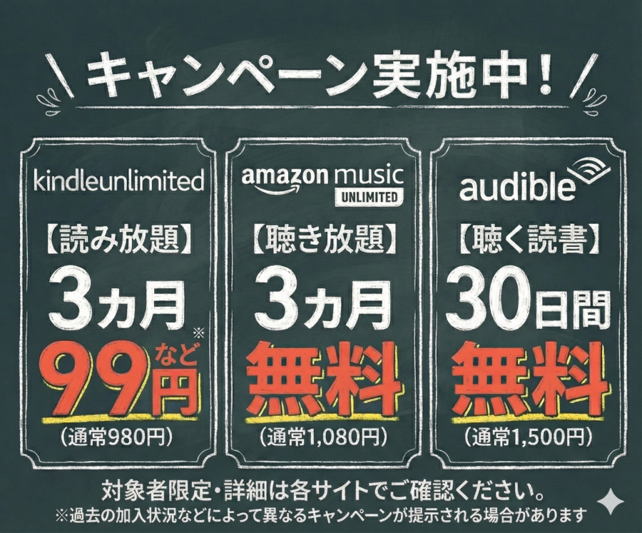 | 年末年始読書フェア | 3ヵ月99円 | 12月27日〜2025年1月7日 | 過去12ヵ月以内にKindle Unlimitedの無料体験・キャンペーンを利用していない人 |