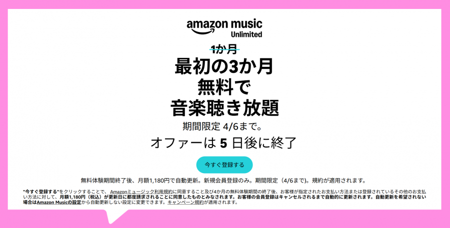 | 3ヵ月無料 | 4月9日〜5月7日 | Amazon Music Unlimitedに新規会員登録される人 |