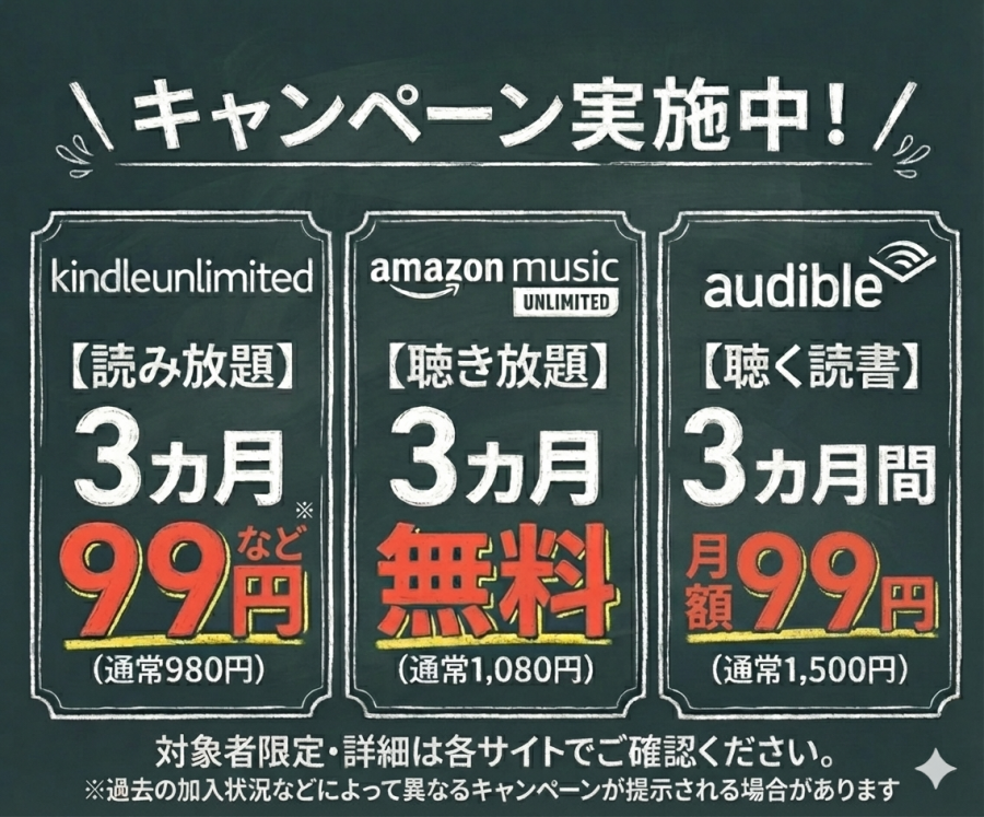Amazonのエンタメサービスが今だけのキャンペーンを実施中!