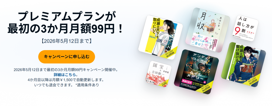 - Audibleのプレミアムプランが3ヵ月間、月額99円で利用できるキャンペーンです。過去の利用歴などで本キャンペーンが適用される場合とそうでない場合があるため、まずはAmazonアカウントにログインした状態で公式サイトを確認してみましょう。