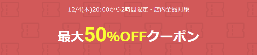2025年12月4日20時から2時間限定で使えるクーポンです。最大50%という、割引率の高さが特徴です。