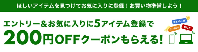 キャンペーンのエントリーと商品を5つお気に入り登録するだけでもらえる、3,000円以上の買い物で200円OFFになるクーポンです。どんな買い物でも使えるため、もらっておいて損はありません。