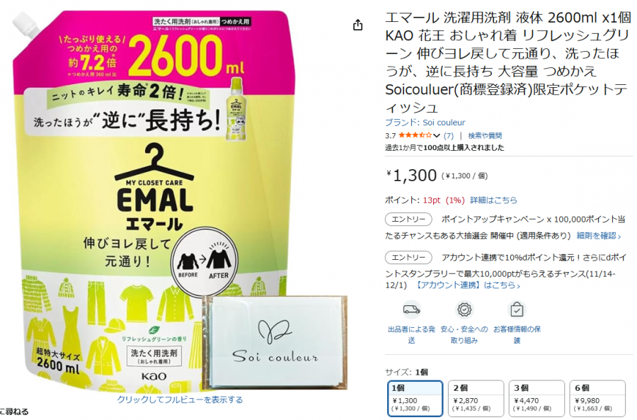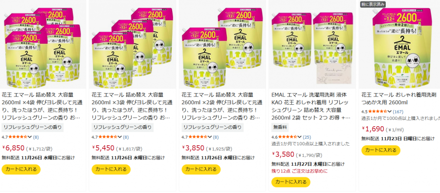 そこには大量のおしゃれ着用「エマール」が並ぶので、この中から最も安いエマールを探さなくてはなりません。