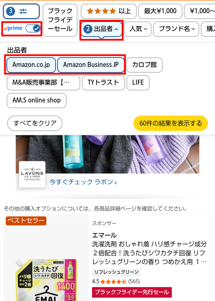 ▲プライム会員であれば「Prime」にチェックを入れれば送料無料の商品に絞れる。「出品者」をAmazonにしておけばさらに安心