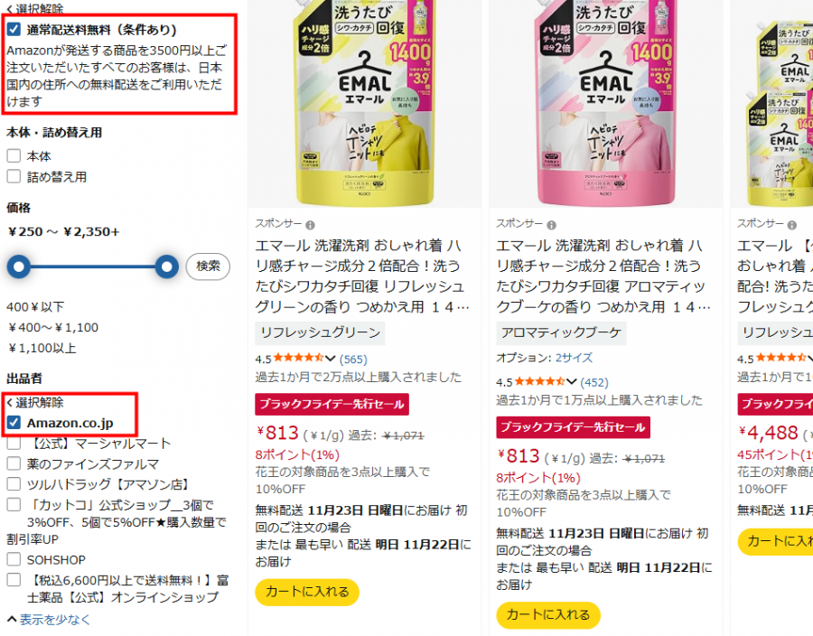 そこですぐさまAmazonアプリを起動し「エマール おしゃれ着 詰め替え」と検索します。Amazonは今、ブラックフライデーの先行セール中。日用品は安くなりやすいので狙い目です。