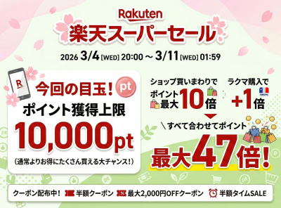 2026年次回の楽天スーパーセールは、2026年3月4日(水)20:00~3月11日(水)01:59の期間で開催されます。
