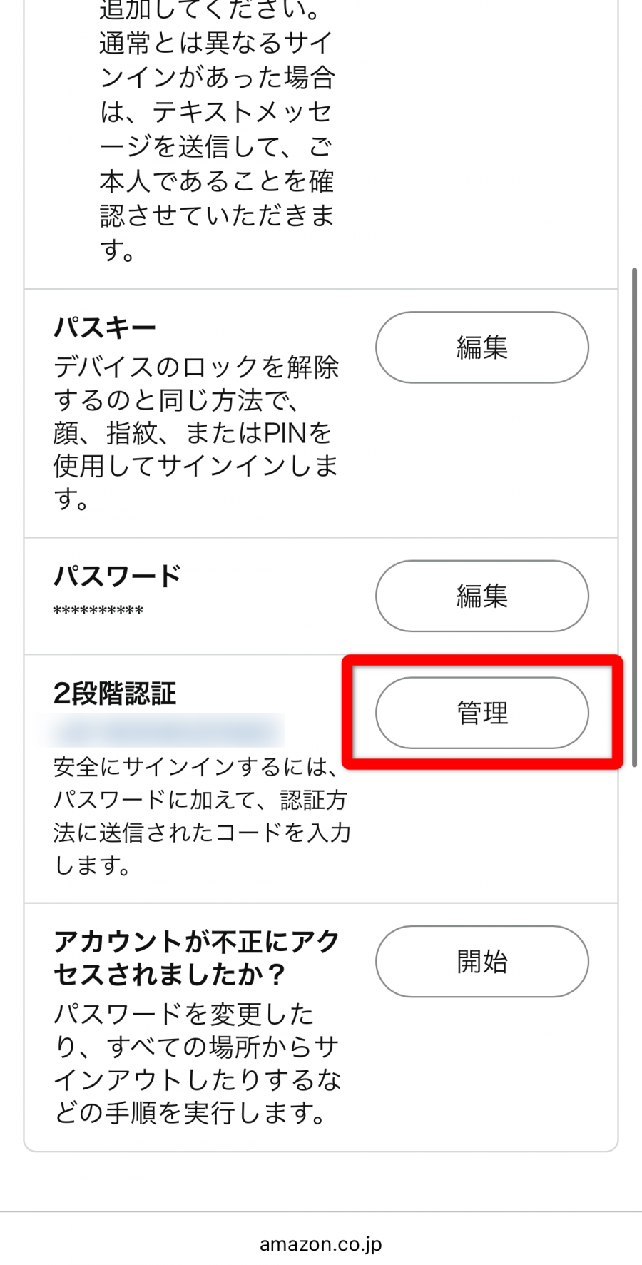 AmazonのWebブラウザのメニューから、「アカウントサービス」>「ログインとセキュリティ」> 2段階認証の「管理」の順にクリックし、2段階認証設定画面へ移動します。