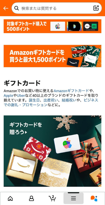 [ギフトカード・ギフトアイデア]をタップしたあと[ギフトカード]をタップ