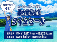 2024年12月17日 (火) 0:00 ~ 12月23日 (月) 23:59までの7日間、全日本空輸(ANA)は国内線・国際線航空券のタイムセールを実施! 羽田-...